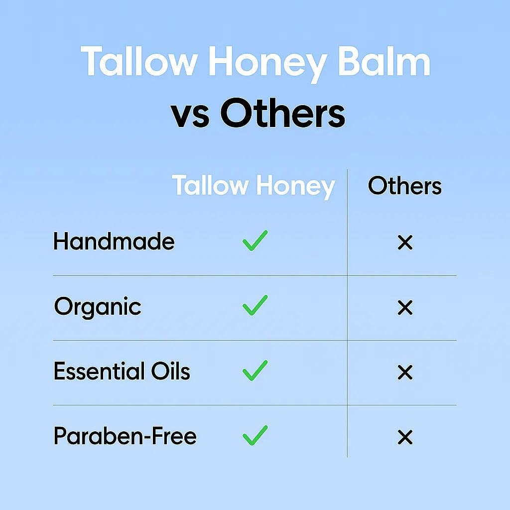 Our Honey Tallow Balm is made with simple, all-natural 🍀 ingredients that are perfect for everyone in the family. We use Grass Fed Beef Tallow, Olive Oil, and Raw Honey to create a balm that’s both gentle and effective. Free from gluten, parabens, phthalates, and additives, it’s a safe choice for sensitive skin. Whether you're moisturizing your baby’s skin or treating your own, our balm delivers the nourishment your skin craves. Made by hand with care, it’s pure skincare the way nature🌿 intended. Give your skin the natural care it deserves today!