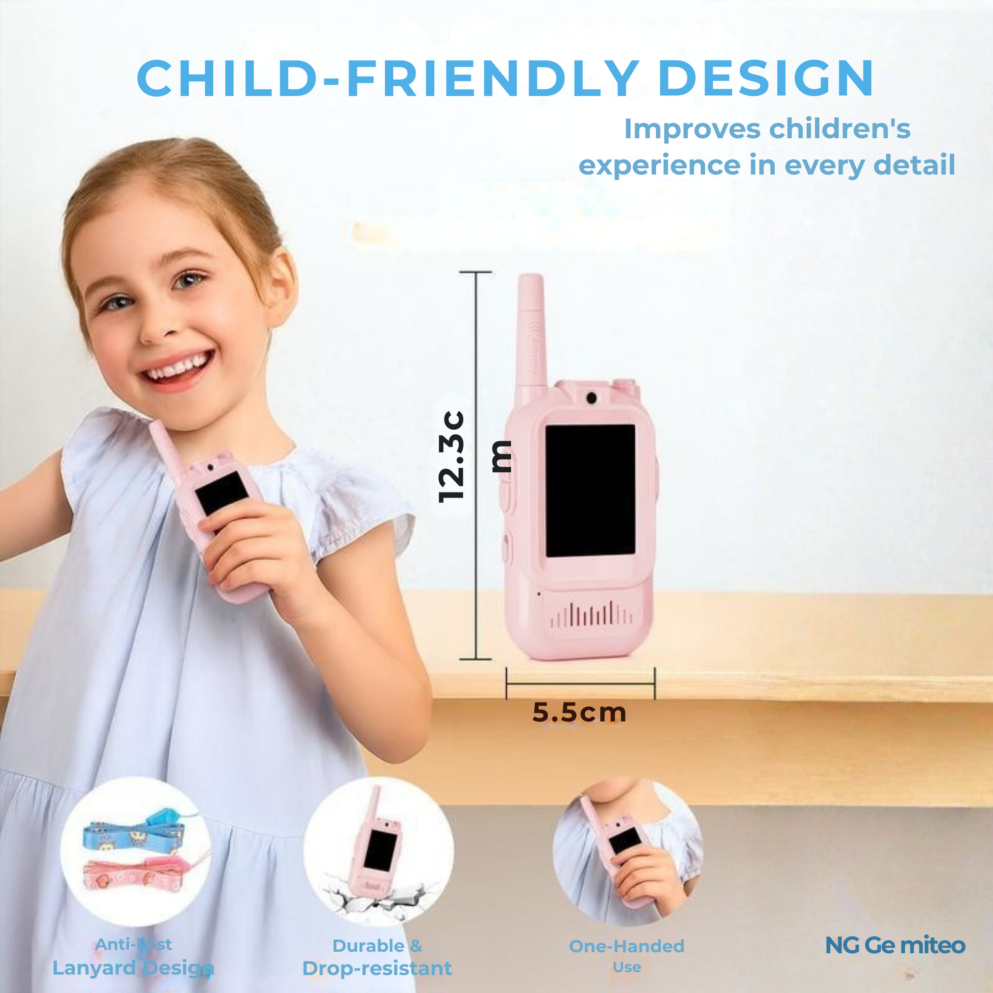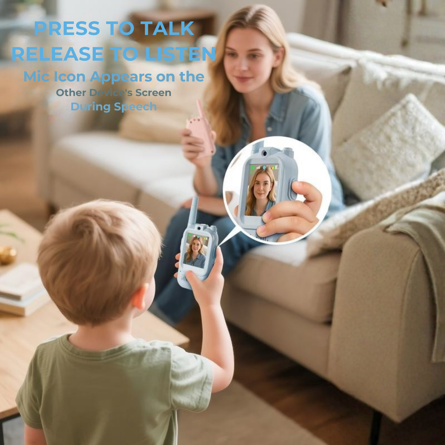 Watch the fun unfold as the family enjoys The BuddyTalk ™️ together! The boy controls the walkie talkies while the mother smiles, creating unforgettable memories.
